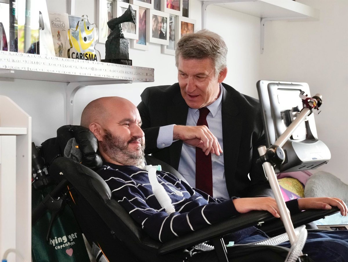 El líder del PP. Alberto Núñez Feijóo, con el activista y paciente de ELA, Jordi Sabaté. - EUROPA PRESS