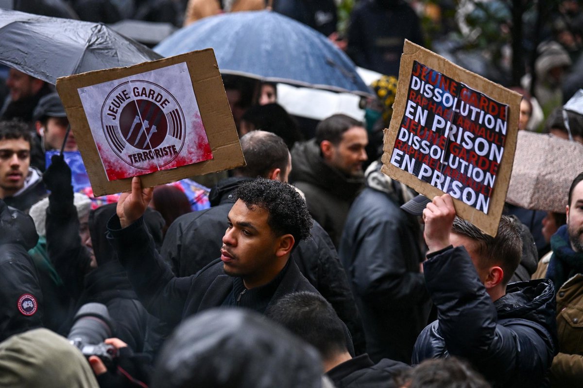 February 15, 2026, Paris, Ile-De-France (Region, France: Activists hold up placards demanding the dissolution of the Young Guard...Gathering of far-right politicians and militants in Place de la Sorbonne to pay tribute to Quentin, who was beaten to death - Europa Press/Contacto/Julien Mattia