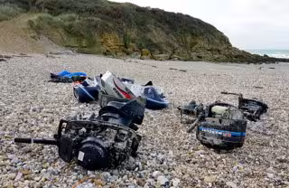 18 November 2021, France, Wimereux: Small boat debris can be seen on the beach in Wimereux near Calais as migrants continue to launch small boats along the coastline in a bid to cross the Channel towards the UK. Photo: Gareth Fuller/PA Wire/dpa - Gareth Fuller/PA Wire/dpa