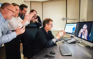 El líder del PP, Alberto Núñez Feijóo, felicita a su candidato, Alfonso Rueda, tras su victoria en las elecciones gallegas del 18 de febrero.
