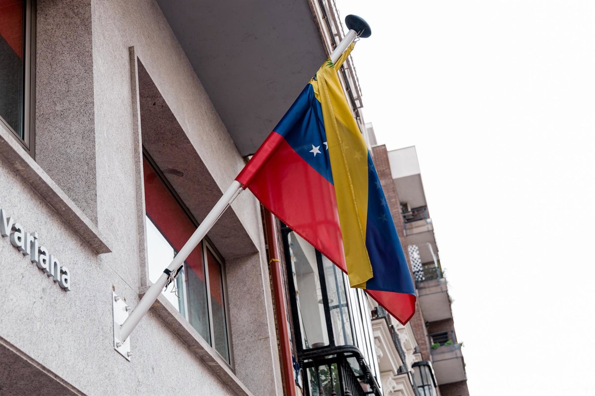 Bandera venezolana en la fachada del Consulado de Venezuela en España, a 3 de enero de 2026, en Madrid (España). El presidente de Venezuela, Nicolás Maduro, se encuentra ahora mismo "bajo arresto" y será sometido a juicio en suelo estadounidense por delit - Carlos Luján - Europa Press