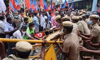Archivo - 27 September 2021, India, Chennai: Police clash with members of Communist parties and various trade unions as they block a road in Chennai to support the farmers strike against the central government's three farm reform laws. Photo: Senthil Ku