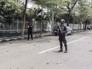 Archivo - 28 March 2021, Indonesia, Makassar: South Sulawesi Regional Police Mobile Brigade members stand guard in front of Makassar Cathedral Church after a bomb explosion. Police said nine people were injured and it was likely a suicide bombing and th - Herwin Bahar/ZUMA Wire/dpa - Archivo