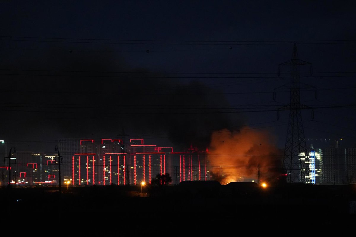 01 March 2026, Iraq, Erbil: Smoke and flames rise near Erbil International Airport in Iraqi Kurdistan following explosions as air defense systems carried out intensive interception operations. Photo: Ismael Adnan/dpa