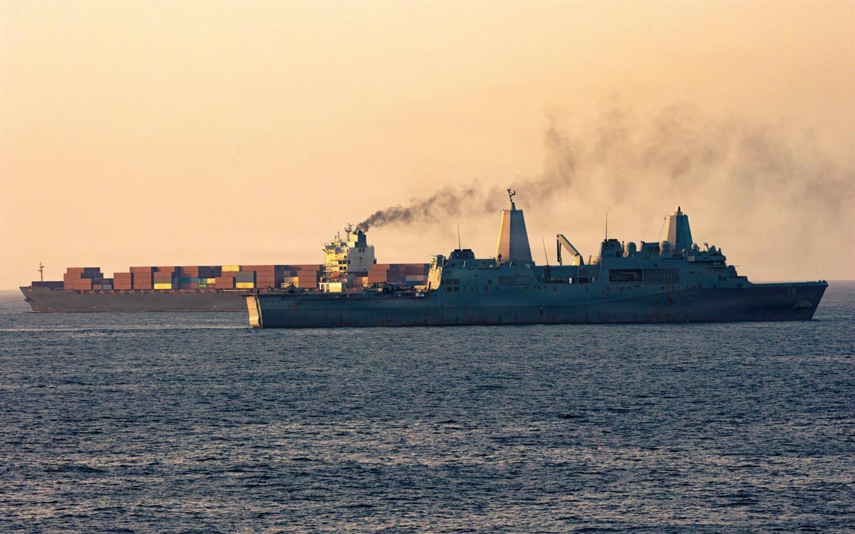 April 22, 2026, Arabian Sea, International Waters: The U.S. Navy San Antonio-class amphibious transport dock ship USS New Orleans guards the Iranian cargo vessel M/V Touska after it was boarded and fired upon for violating the maritime blockade against sh