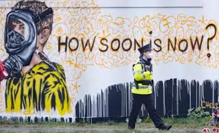 18 April 2021, United Kingdom, Dublin: A police officer walks past a new mural at Dublin's Grand Canal Docks by the artist CHELS (Chelsea Jacobs), reflecting the uncertain future of children due to Covid-19 restrictions. Photo: Niall Carson/PA Wire/dpa - Niall Carson/PA Wire/dpa