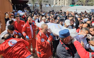 Funerales por los ocho trabajadores sanitarios de la Media Luna Roja que fallecieron tras un ataque israelí en Rafá y cuyos cadáveres han sido recuperados de un fosa común