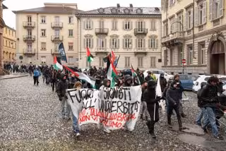 23 April 2024, Italy, Turin: Pro-Palestine students take part in the "Zionists out of the University" march against the conference organized by the Polytechnic in the presence of Antonio Tajani, Anna Maria Bernini, the leadership of the Maeci announceme - Matteo Secci/LaPresse via ZUMA P / DPA