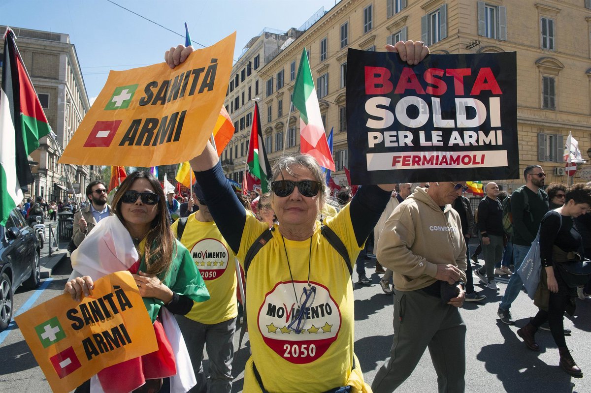 Unas 100.000 personas, según los convocantes, se han manifestado este sábado contra el plan de rearme europeo en Roma, la capital italiana, en una iniciativa del partido político Movimiento Cinco Estrellas.