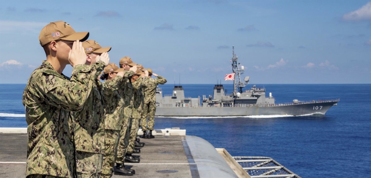 Archivo - STYLELOCATIONU.S. Navy sailors aboard the Nimitz-class aircraft carrier USS Carl Vinson salute as the Japan Maritime Self-Defense Force Murasame-class destroyer JS Ikazuchi passes alongside during joint operations September 19, 2021 in the Phili - Europa Press/Contacto/Mc2 Aaron T. Smith/U.S. Navy