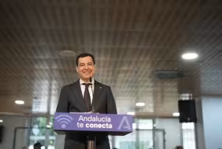 El presidente de la Junta, Juanma Moreno, ha presentado este lunes en Sevilla la Red Wifi Andalucía Vuela