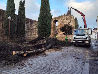 Trabajadores municipales del Ayuntamiento de Mérida recoge árboles caídos por el temporal Kristin en el entorno de la Alcazaba árabe.