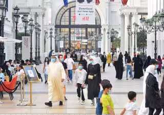 Personas con mascarilla en un centro comercial en Kuwait