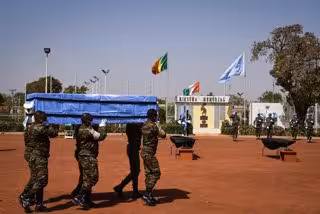 Archivo - 19 January 2021, Mali, Bamako: Soldiers carry the coffin of one of the four Ivorian peacekeepers who died following an attack on January 13, 2021, during the commemorative ceremony held at the headquarters of United Nations Integrated Multidim