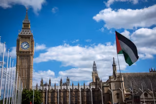 Archivo - August 9, 2025, London, United Kingdom: A large Palestinian flag is displayed at Houses of Parliament, Parliament Square during the National March for Palestine - Stop Starving Gaza - Stop Arming Israel in central London. Following the Home Secr