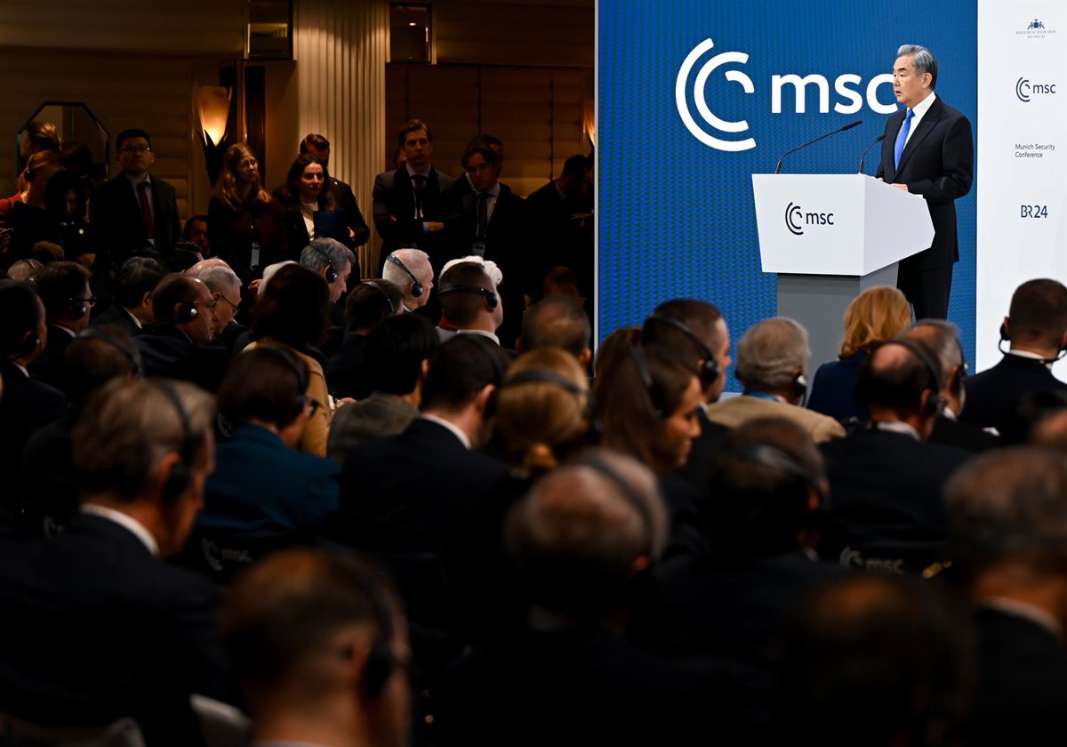 14 February 2026, Bavaria, Munich: Chinese Foreign Minister Wang Yi speaks at the 62nd Munich Security Conference. Photo: Sven Hoppe/dpa