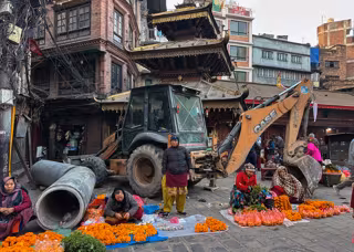 Archivo - December 16, 2025, Kathmandu, Nepal: Women flower vendors continue their trade in front of a bulldozer brought for alley excavation at Ason Market in Kathmandu, Nepal, on December 16, 2025. - Europa Press/Contacto/Sunil Sharma - Archivo
