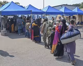 21 August 2021, Rhineland-Palatinate, Ramstein-Miesenbach: Afghan refugees evacuated from Kabul line up for processing after arrival from Kabul at Ramstein Air Base. Ramstein Air Base provides temporary housing for evacuees from Afghanistan as part of O