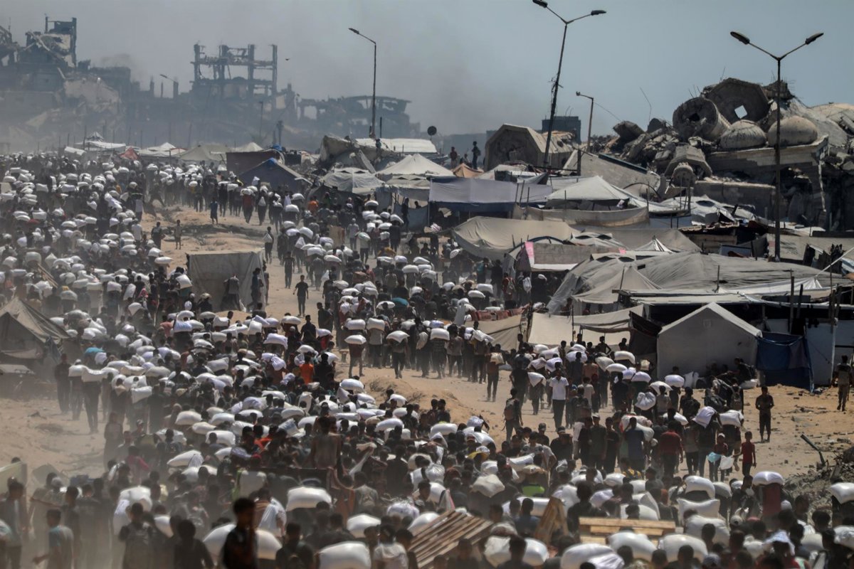GAZA, Oct. 8, 2025 -- Palestinians fetch humanitarian aid that entered Gaza through a border crossing, in Beit Lahia, northern Gaza Strip, on July 27, 2025. As Hamas and Israel are meeting in Egypt over a potential ceasefire the world anxiously awaits, G - Europa Press/Contacto/Rizek Abdeljawad