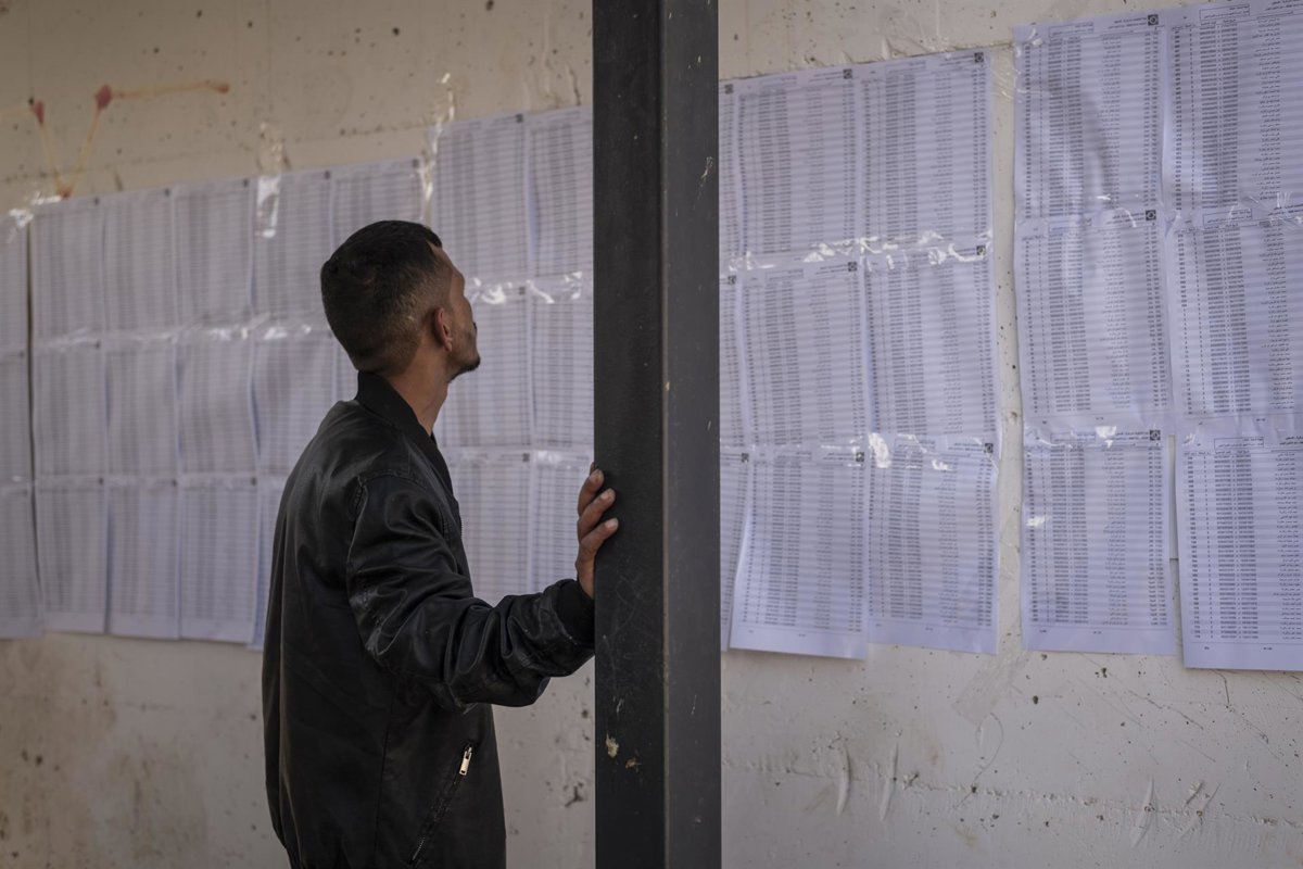 April 25, 2026, Jenin, West Bank, Palestine: A voter looks at the candidates lists scotch taped on the walls, inside the local school of Qabatiya village, Jenin area, occupied West Bank. - Europa Press/Contacto/Matteo Placucci