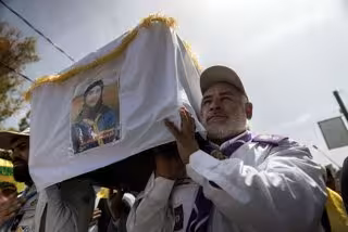 April 25, 2024, Hanin, Lebanon: A man carries the casket Sarah Hussein Qashqash, 10, during a funeral procession for her and her aunt at Hanin, Lebanon on April 25, 2024. They were killed April 23 by an Israeli airstrike that targeted their family home.
