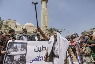 23 April 2021, Palestinian Territories, Jabalya: Palestinians chant slogans during a rally after nightly clashes with Israeli security forces in East Jerusalem after Israeli police prevented access to some areas where Palestinians usually congregate in