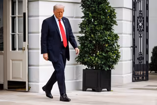 September 7, 2025, Washington, District Of Columbia, USA: United States President Donald J Trump walks out of the South Portico of the White House towards the gathered press before departing in Marine One from the South Lawn on September 7, 2025 in Washin