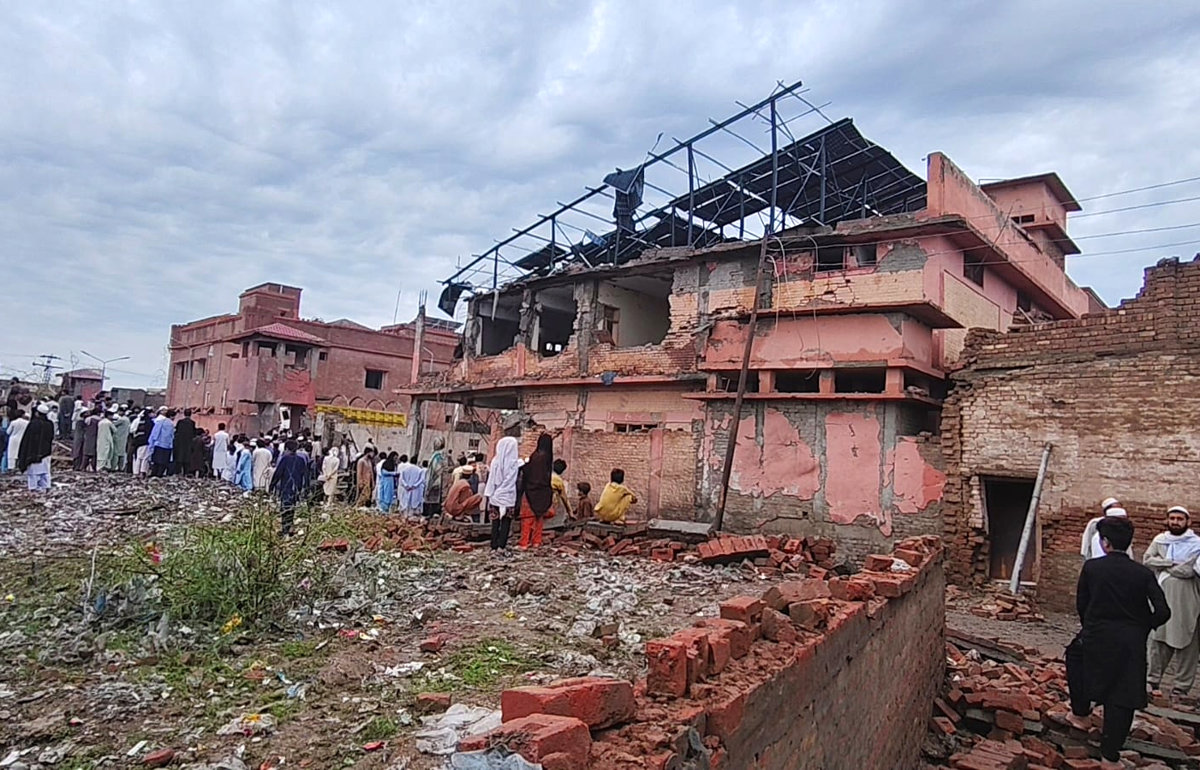 BANNU, April 3, 2026  -- People gather near a building damaged in a blast in Bannu district of Pakistan's northwestern Khyber Pakhtunkhwa province, April 3, 2026. At least five civilians were killed and several others, including two police personnel, were