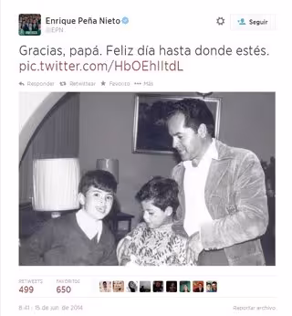 El presidente de México, Enrique Peña Nieto, ha tenido un entrañable detalle en el marco del día del padre, que se celebraba internacionalmente este domingo, y como homenaje actualizó su perfil en la red social Twitter con una fotografía familiar en la que se le veía de niño junto a su hermano y su padre.