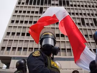 07 December 2022, Peru, Lima: A riot police officer with a gas mask stands under a Peruvian flag during a protest to celebrate the removal of President Pedro Castillo by congress for 'moral incapacity' after attempting a failed coup that sought to shut - Carlos Garcia Granthon/ZUMA Pres / DPA