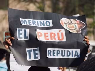 Archivo - Un participante en las protestas contra el expresidente Manuel Merino sostiene una pancarta que reza "Merino, el Perú te repudia".