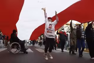 Archivo - Un manifestante salta debajo de una bandera de Perú en una manifestación en apoyo a Pedro Castillo. - Cesar Campos/dpa - Archivo