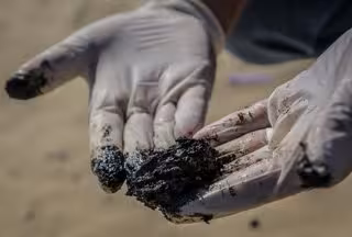 Archivo - 27 February 2021, Lebanon, Tyre: A Lebanese volunteer holds tar during a cleaning campaign of beaches at the city of Tyre, after an oil spill deposited tar over large stretches of the coast in the southern part of Lebanon. Tar from an offshore