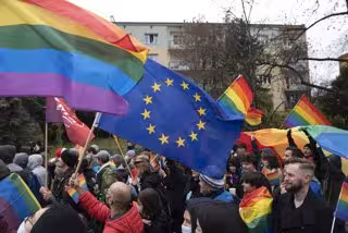 23 October 2021, Poland, Lublin: People wave rainbow and a European Union flags during Lublin's 3rd LGBT pride parade. Photo: Aleksander Kalka/ZUMA Press Wire/dpa - Aleksander Kalka/ZUMA Press Wire / DPA