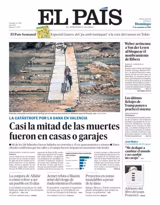 EL PAÍS: "Casi la mitad de las muertes fueron en casas y garajes"; "La conjura de Alfafar o cómo volver a ser un pueblo en 15 días"; "Aemet refuta a Mazón: avisó del riesgo de riada mientras él comía"; "Proyectos en zonas inundables a pesar de la dana"; "Weber arrincona a Von der Leyen al bloquear el nombramiento de Ribera"; "Los últimos fichajes de Trump ponen a prueba el sistema".