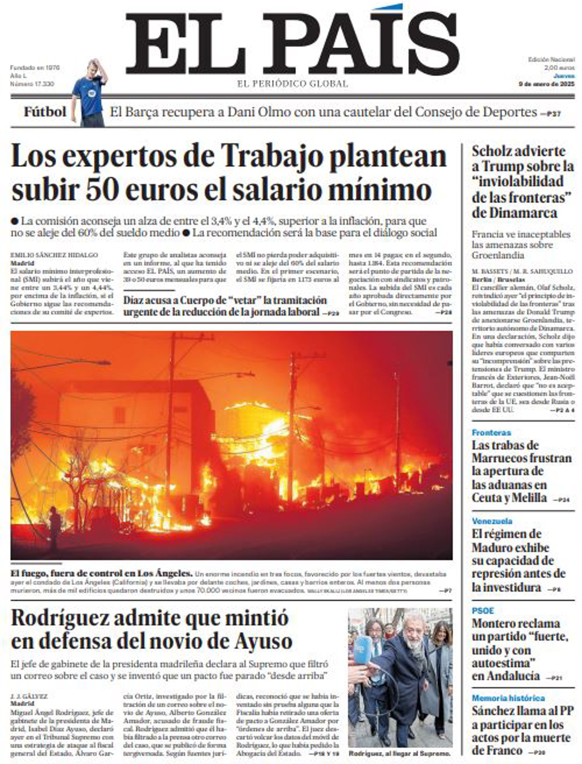 EL PAÍS: "Los expertos de Trabajo plantean subir 50 euros el salario mínimo"; "Rodríguez admite que mintió en defensa del novio de Ayuso"; "Scholz advierte a Trump sobre la "inviolabilidad de las fronteras" de Dinamarca"; "Las trabas de Marruecos frustran la apertura de las aduanas en Ceuta y Melilla"; "El régimen de Maduro exhibe su capacidad de represión antes de la investidura"; "Montero reclama un partido "fuerte, unido y con autoestima" en Andalucía"; "Sánchez llama al PP a participar en los actos por la muerte de Franco".