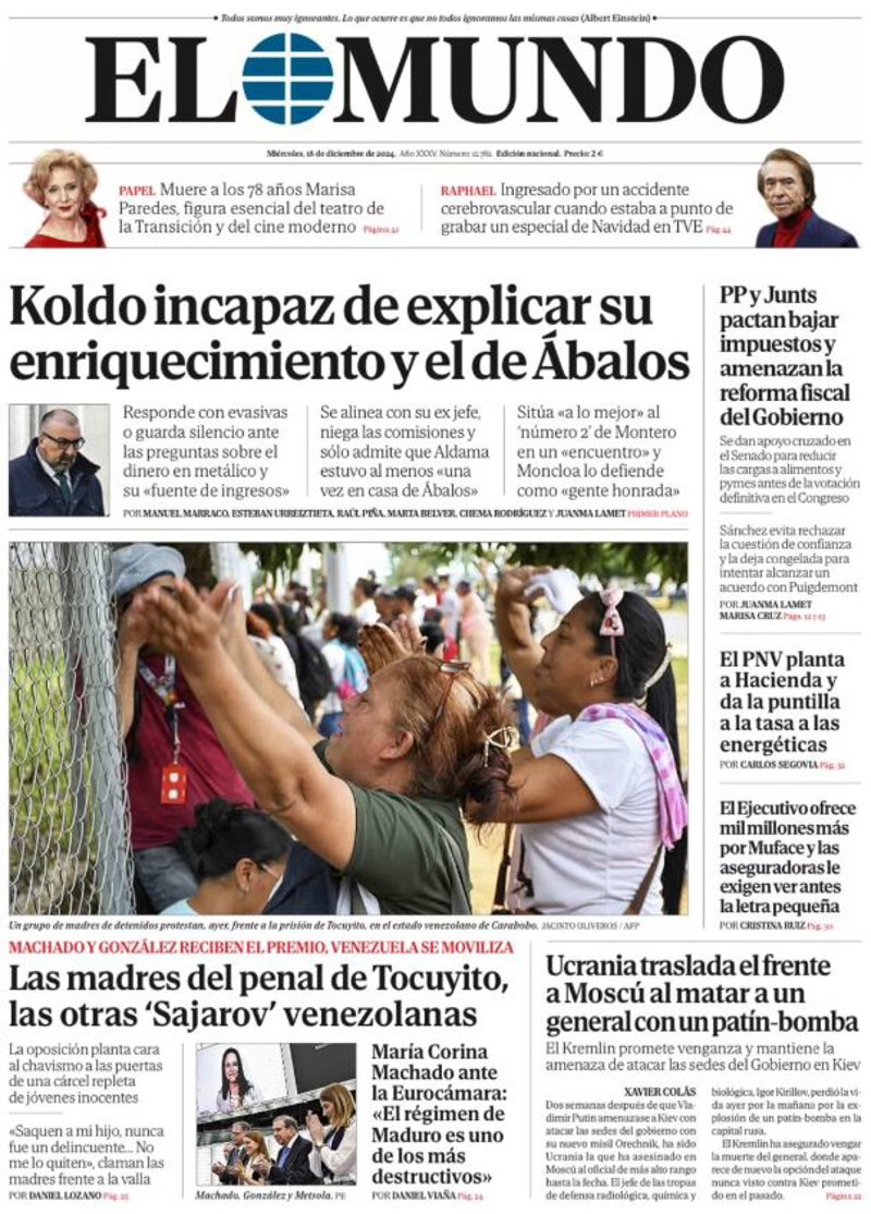EL MUNDO: "Koldo incapaz de explicar su enriquecimiento y el de Ábalos"; "Las madres del penal de Tocuyito, las otras 'Sajarov' venezolanas"; "