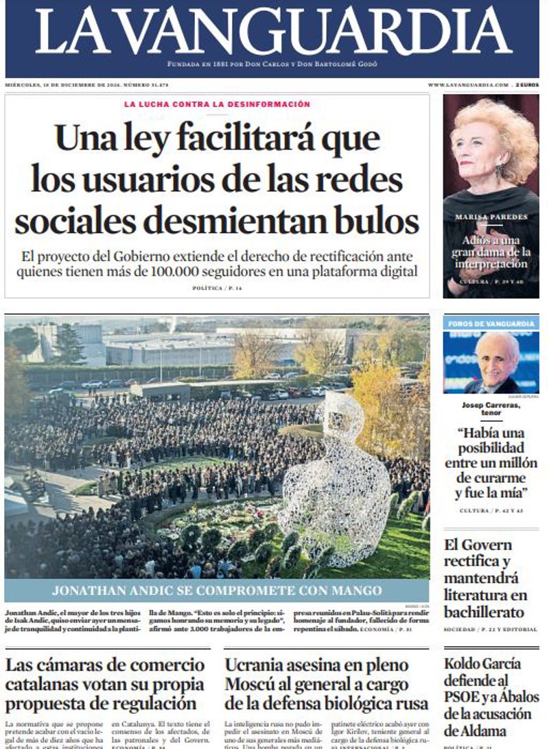 LA VANGUARDIA: "Una ley facilitará que los usuarios de las redes sociales desmientan bulos"; "Las cámaras de comercio catalanas votan su propia propuesta de regulación"; "Ucrania asesina en pleno Moscú al general a cargo de la defensa biológica rusa"; "Josep Carreras, tenor: "Había una posibilidad entre un millón de curarme y fue la mía""; "El Govern rectifica y mantendrá literatura en bachillerato"; "Koldo García defiende al PSOE y a Ábalos de la acusación de Aldama".