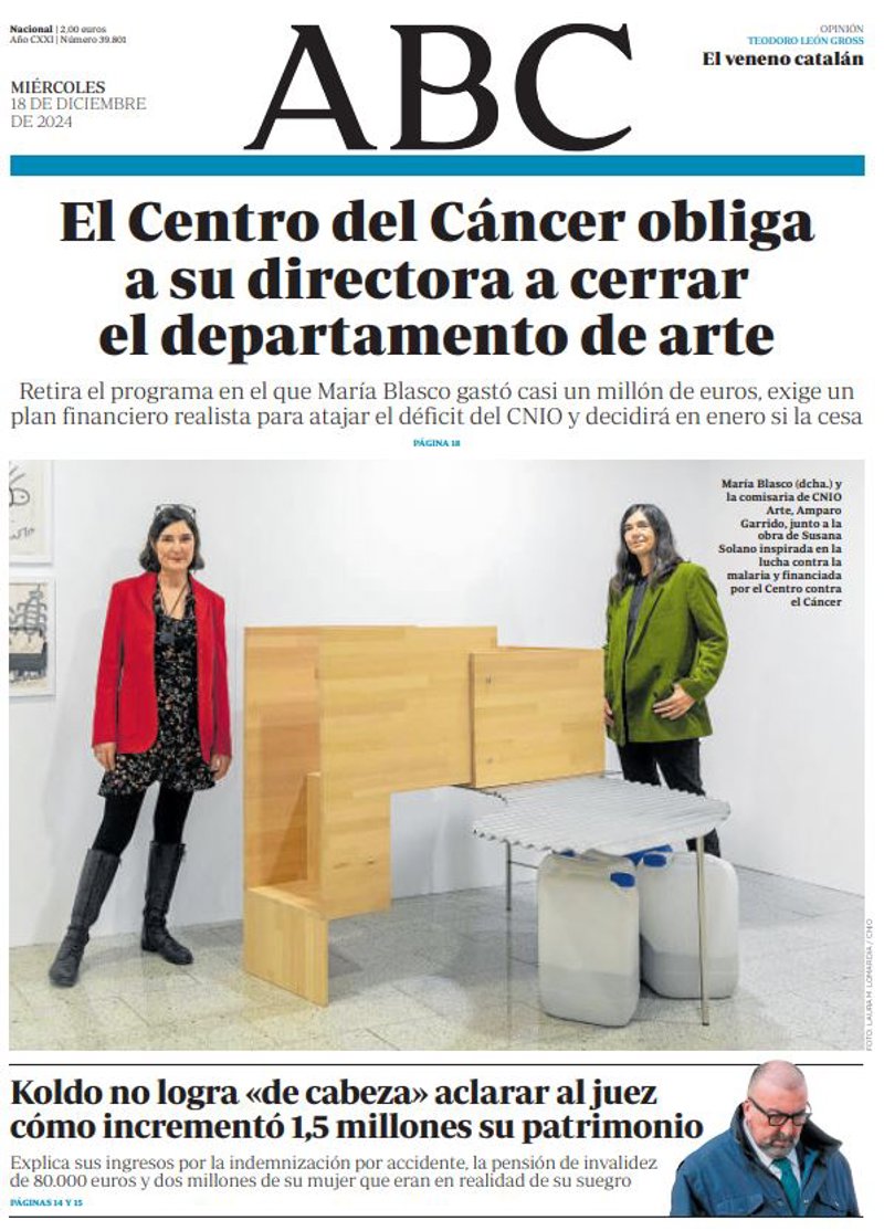 ABC: "El Centro del Cáncer obliga a su directora a cerrar el departamento de arte"; "Koldo no logra "de cabeza" aclarar al juez cómo incrementó 1,5 millones su patrimonio".