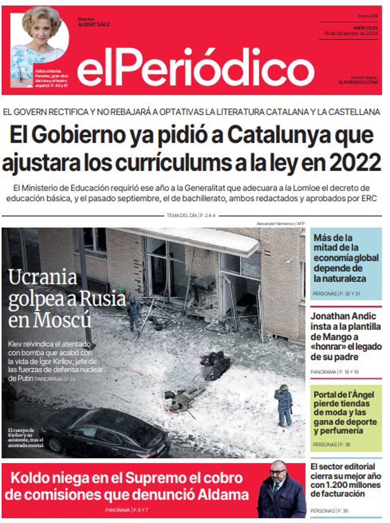 EL PERIÓDICO: "El Gobierno ya pidió a Catalunya que ajustara los currículums a la ley en 2022"; "Ucrania golpea a Rusia en Moscú"; "Koldo niega en el Supremo el cobro de comisiones que denunció Aldama"; "Más de la mitad de la economía global depende de la naturaleza"; "Jonathan Andic insta a la plantilla de Mango a *honrar* el legado de su padre"; "Portal de l'ngel pierde tiendas de moda y las gana de deporte y perfumería"; "El sector editorial cierra su mejor año con 1.200 millones de facturación".
