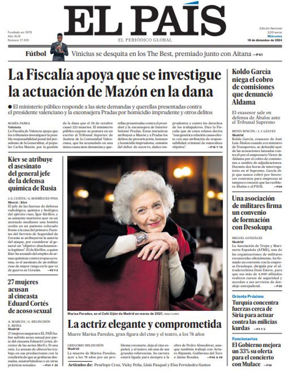 EL PAÍS: "La Fiscalía apoya que se investigue la actuación de Mazón en la dana"; "La actriz elegante y comprometida"; "Kiev se atribuye el asesinato del general jefe de la defensa química de Rusia"; "27 mujeres acusan al cineasta Eduard Cortés de acoso sexual"; "Koldo García niega el cobro de comisiones que denunció Aldama"; "Una asociación de militares firma un convenio de formación con Desokupa"; "Turquía concentra fuerzas cerca de Siria para actuar contra las milicias kurdas"; "El Gobierno mejora un 33% su oferta para el concierto con Muface".