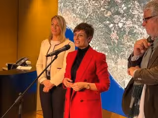 La portavoz del Gobierno y ministra de Política Territorial, Isabel Rodríguez, junto la delegada del Gobierno en Catalunya, Maria Eugnia Gay, y el vicepresidente ejecutivo del AMB, Antonio Balmón.
