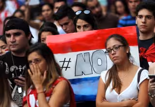 A protester holds a sign in the colours of Paraguay's national flag that reads N