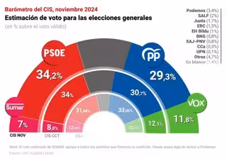 Gráfico con estimación de voto para las elecciones generales según el Barómetro de noviembre del Centro de Investigaciones Sociológicas (CIS), publicado el 18 de noviembre de 2024.