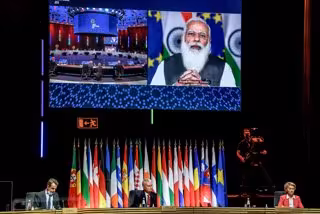 HANDOUT - 08 May 2021, Portugal, Porto: EU Commission President Ursula von der Leyen (R) participates in an online summit with Indian Prime Minister Narendra Modi during the EU summit round table meeting at the Crystal Palace. Photo: Etienne Ansotte/Eur - Etienne Ansotte/European Commiss / DPA