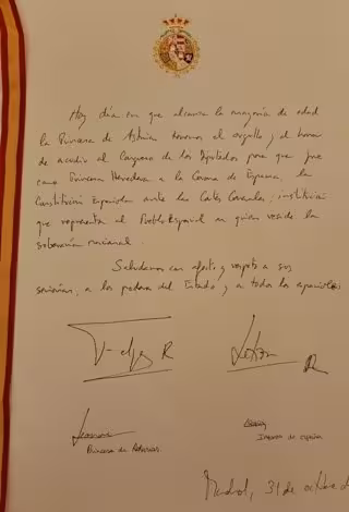 "Hoy, día en que alcanza la mayoría de edad la Princesa de Asturias, tenemos el orgullo y el honor de acudir al Congreso para que jure, como princesa heredera a la Corona de España, la Constitución Española ante las Cortes Generales; institución que representa al Pueblo Español, en quien reside la soberanía nacional", ha dejado escrito.