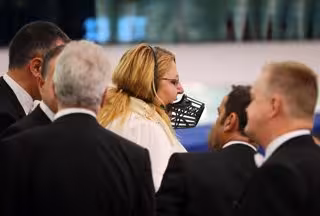 Archivo - 18 July 2024, France, Strasbourg: Diana Iovanovici Sosoaca (C), a Romanian Member of the European Parliament, wears a muzzle in front of her face during a protest at the European Parliament's plenary session. The EU Parliament votes on a second