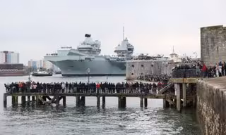 01 May 2021, United Kingdom, Portsmouth: The Royal Navy aircraft carrier "HMS Queen Elizabeth" leaves the naval base in Portsmouth harbour, to sail for exercises off Scotland before heading for the Indo-Pacific region. Photo: Andrew Matthews/PA Wire/dpa