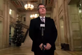 Archivo - 02 January 2020, Northern Ireland, Belfast: Jeffrey Donaldson, Leader of the Democratic Unionist Party in the House of Commons, speaks to the press upon arrival at the Great Hall of Parliament Buildings Stormont as talks aimed at restoring pow
