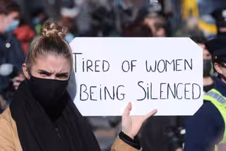 16 March 2021, Ireland, Dublin: A protester holds a sign during a protest organised in remembrance of murdered Sarah Everard and in protest of continued violence against women. Photo: Niall Carson/PA Wire/dpa - Niall Carson/PA Wire/dpa